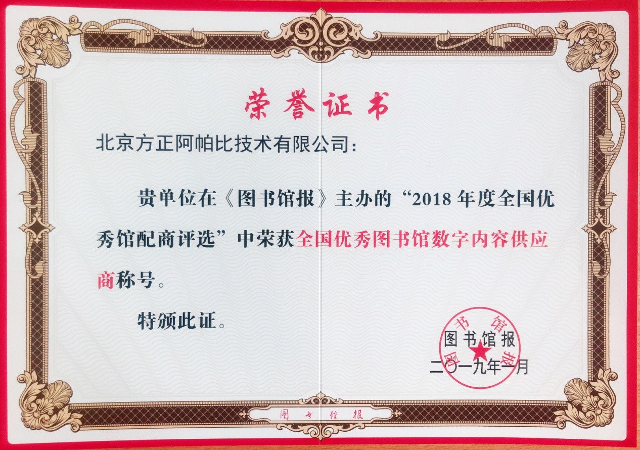 論壇期間進(jìn)行了全國優(yōu)秀館配商頒獎典禮,這是館配行業(yè)共建共享的權威評選活動(dòng),也是業(yè)內公認的評價(jià)館配企業(yè)的重要參考指標。在2018全國優(yōu)秀館配商評選活動(dòng)中,北京方正阿帕比技術(shù)有限公司脫穎而出,獲得“2018全國優(yōu)秀圖書(shū)館數字內容供應商”殊榮。