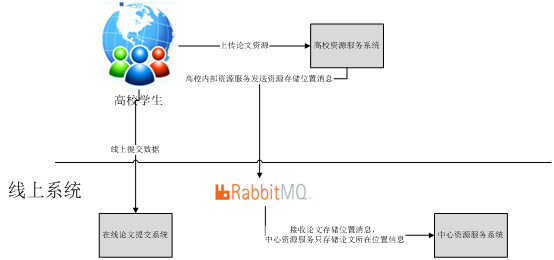 為了提高對高校使用論文提交系統的支持及快速響應,論文提交系統在線(xiàn)部署,高校對論文的提交、學(xué)校信息、學(xué)生信息等的管理使用線(xiàn)上服務(wù),可以做到有問(wèn)題及時(shí)響應。同時(shí)為了滿(mǎn)足高校對論文安全性的要求,本系統中將資源存儲從線(xiàn)上服務(wù)獨立出來(lái)形成了資源服務(wù)系統,部署在高校。學(xué)生上傳的論文資源直接存儲在高校部署的資源服務(wù)系統中,從而達到在線(xiàn)提供優(yōu)質(zhì)服務(wù),線(xiàn)下提供資源管理服務(wù)提升論文安全性。